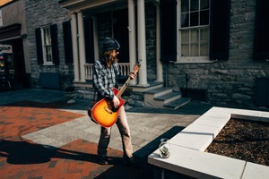 A young musician stands casually in a sunlit street, his acoustic guitar cradled in his arms, embodying a moment of exploration and creativity. The warm autumnal light enhances the textures of the historic surroundings, creating a relaxed atmosphere that contrasts with the polished stones and bricks of the street. A glass jar sits nearby, hinting at the hope of support and connection from passersby.