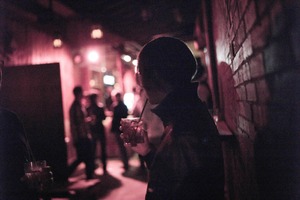 In a dimly lit bar, a person sits against a textured brick wall, holding a drink. The moody ambiance is accentuated by soft pink lighting, creating a sense of intimacy and mystery among the indistinct figures in the background. The composition captures a fleeting moment, blending stillness with the dynamic energy of nightlife.