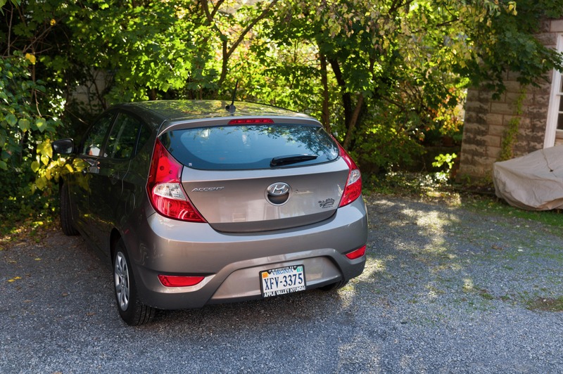 A silver Hyundai Accent is parked nestled among lush greenery, symbolizing a quiet retreat from the hustle of urban life. The sunlight gently illuminates the scene, casting soft shadows that enhance the serene mood. The composition balances the vehicle with the rich textures of nature, creating a harmonious blend of modern design and organic surroundings.