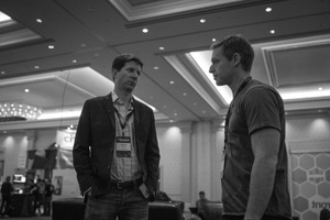 In a monochromatic setting, two men engage in a serious conversation, their expressions reflecting a mix of contemplation and concern. The elegant space around them, adorned with soft lighting and architectural details, contrasts with the intensity of their dialogue, creating a palpable mood of focus and tension. The composition highlights their body language, emphasizing the importance of connection amidst a bustling environment.