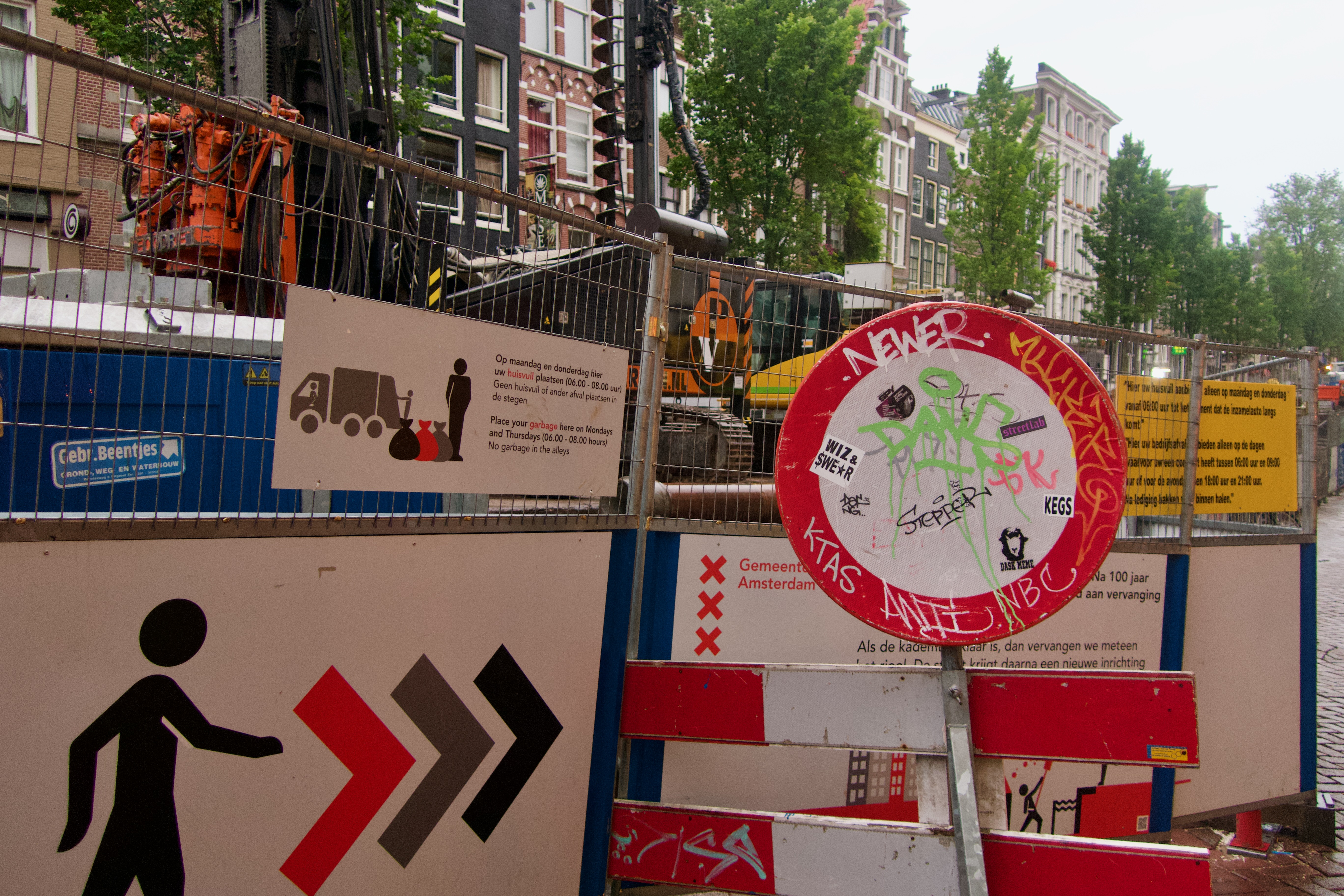 A chaotic construction site is the focal point, where vibrant graffiti clashes with official signage. The mood is a mix of industriousness and urban grit, captured under overcast skies that soften the harshness of the scene. Traffic barriers and machinery frame the composition, highlighting the disruption of city life.