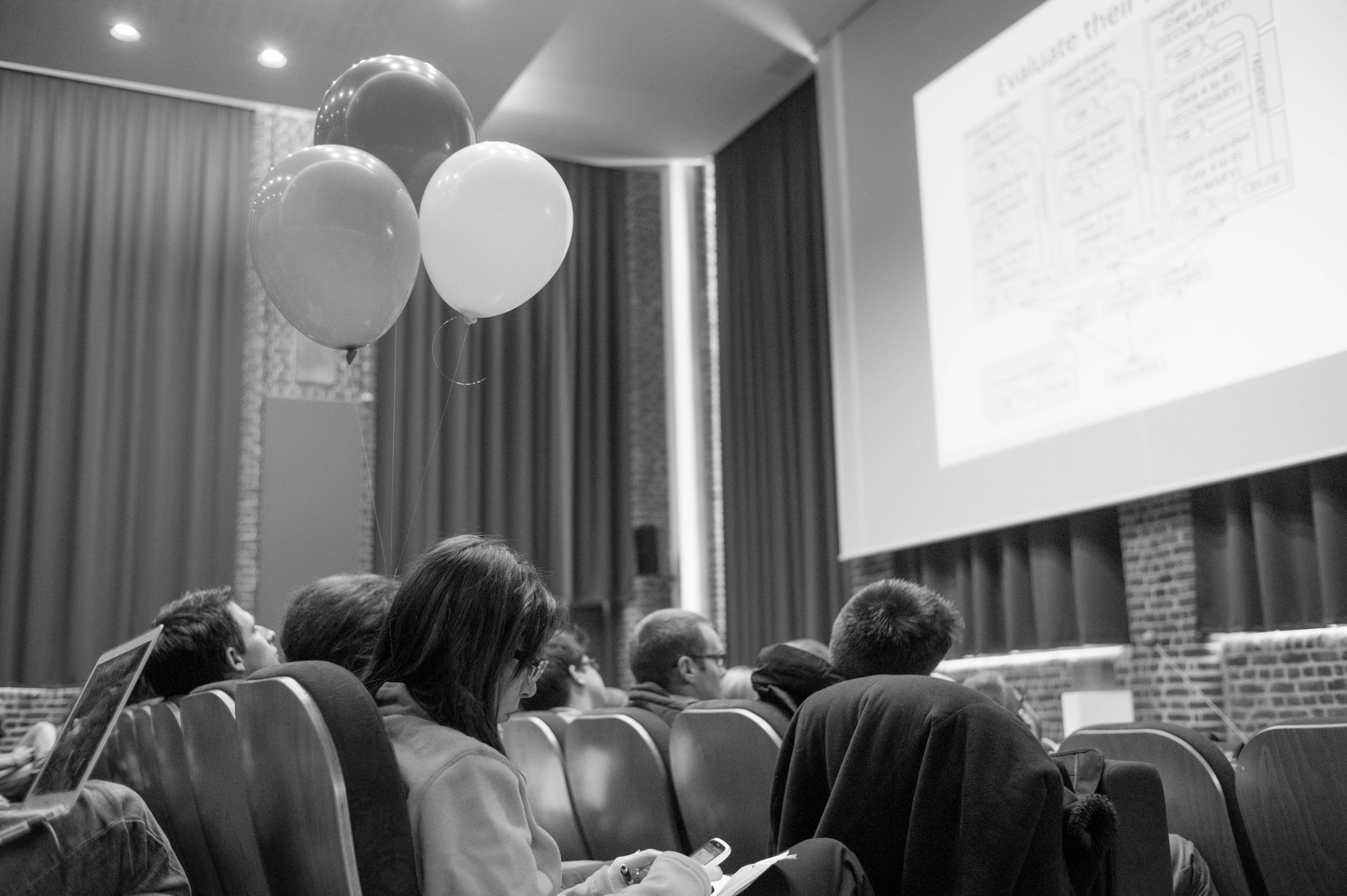In a monochromatic setting, a solitary figure occupies the foreground, tapping notes with a balloon hovering above, symbolizing whimsy amidst the seriousness of a conference. The attendees are absorbed in the presentation, their expressions hinting at contemplation and engagement. The soft lighting and orderly composition evoke a blend of focus and light-heartedness, enhancing the poignant juxtaposition of celebration in a scholarly environment.
