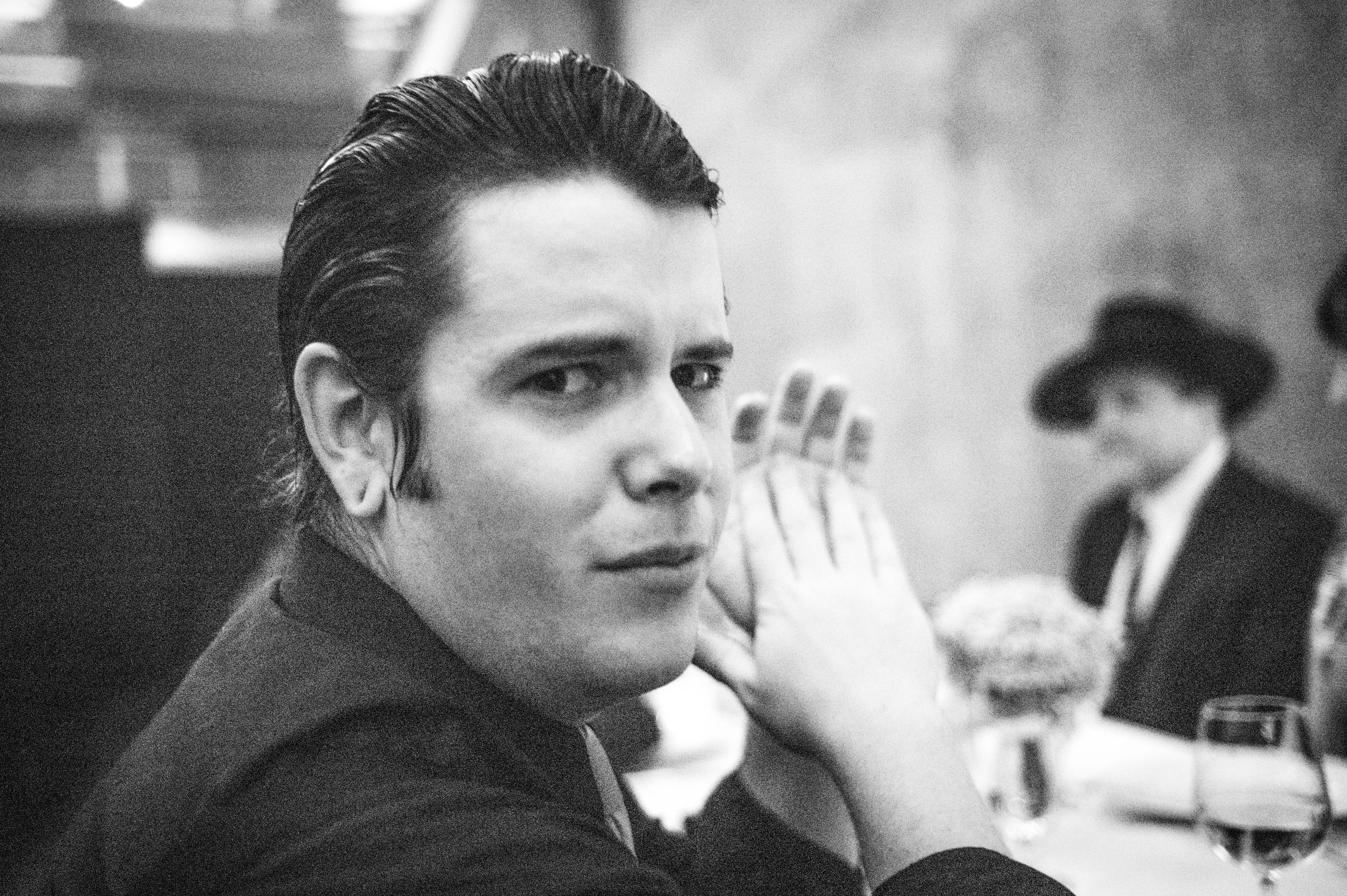In this black and white photograph, a young man with slicked-back hair turns to face the camera, his expression a mix of curiosity and contemplation. The soft, dim lighting creates an intimate atmosphere that contrasts with the blurred figures in the background, enhancing the sense of isolation around him. His hands are clasped together, suggesting anticipation or secrecy, leaving the viewer intrigued about the scene's context.