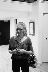 In this black-and-white photograph, a young woman stands thoughtfully in a softly lit interior space. Her casual attire and subtle demeanor convey a sense of introspection, while the contrasting shadows create a moody atmosphere that invites contemplation. The minimalist backdrop highlights her figure, drawing attention to her expression and the quiet ambiance around her.
