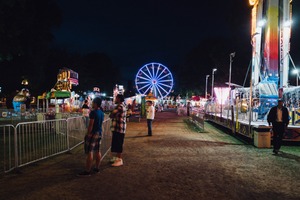 A vibrant carnival scene unfolds under the night sky, illuminated by colorful lights from the rides. The mood is a mix of excitement and nostalgia, as a few figures wander the path, absorbed in the festive atmosphere. The composition draws the viewer’s eye toward the dazzling Ferris wheel, contrasting against the darkened background that hints at mystery and anticipation.
