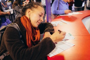 A young woman concentrates intently as she fills out a form, showcasing a mood of determination amidst a lively backdrop. The rich orange of her scarf contrasts with the vibrant red table, drawing attention to her focused expression and the details of her task. Soft lighting enhances the warmth of the scene, emphasizing the collaborative atmosphere of a bustling event.