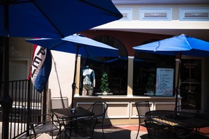This photograph captures a quaint outdoor cafe setting, filled with black metal tables and bright blue umbrellas that provide shade from the sun. The mood is inviting and relaxed, accented by the vibrant colors and a playful display of art in the window, creating a fusion of culinary and artistic charm. The lighting is warm and bright, enhancing the inviting atmosphere of the cafe while gently emphasizing the textures and details of the surroundings.