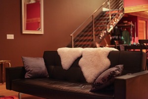 In this intimate living space, a sleek black sofa adorned with fluffy white throws invites relaxation. The warm, earthy tones of the walls and soft lighting create a serene atmosphere, while the modern staircase and furnishings add a touch of contemporary elegance. The composition captures a moment of comfort and style, perfect for unwinding at home.