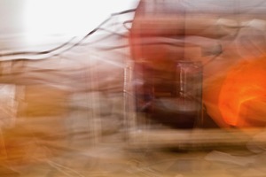 The photograph captures a dynamic interplay of light and color, with swirling forms that evoke a sense of movement and emotion. Soft, warm tones blend into one another, creating an abstract composition that feels both chaotic and harmonious. The use of intentional blurring hints at a fleeting moment, inviting the viewer to ponder the nature of perception and reality.