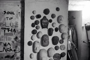 The photograph captures a textured wall adorned with an eclectic array of masks and faces, creating an intimate yet eerie atmosphere. Graffiti on the left hints at a bustling past, contrasting with the solemnity of the monochrome masks, including a central Buddha figure that draws the eye. Soft, diffused lighting from the right subtly illuminates the scene, enhancing the sense of mystery and depth.