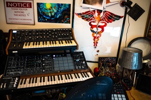 The photograph captures an intimate music production space, filled with an array of synthesizers and equipment that hints at both creativity and chaos. The warm, ambient lighting creates a cozy atmosphere, while colorful artwork and eclectic decor add vibrancy to the setting. This space exudes a mood of inspiration and artistic exploration, inviting viewers into a world of sonic possibilities.