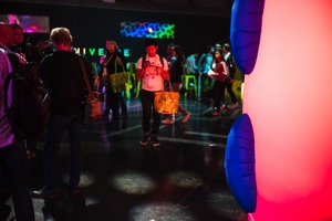 The photograph captures a lively scene filled with people mingling at a vibrant event, illuminated by colorful lighting that creates dynamic shadows on the floor. In the foreground, a large inflatable structure adds a playful touch, contrasting with the focused expressions of attendees engaged with their devices. The overall mood is energetic and festive, showcasing a blend of social interaction with a backdrop of striking visual elements.