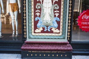 The photograph captures a beautifully ornate display of architectural craftsmanship, featuring intricate details and vibrant colors. The juxtaposition of the decorative molding against the modern window display creates a dialogue between the past and present, evoking a sense of nostalgia. Bright, natural light enhances the textures and colors, giving the scene a lively yet refined atmosphere.