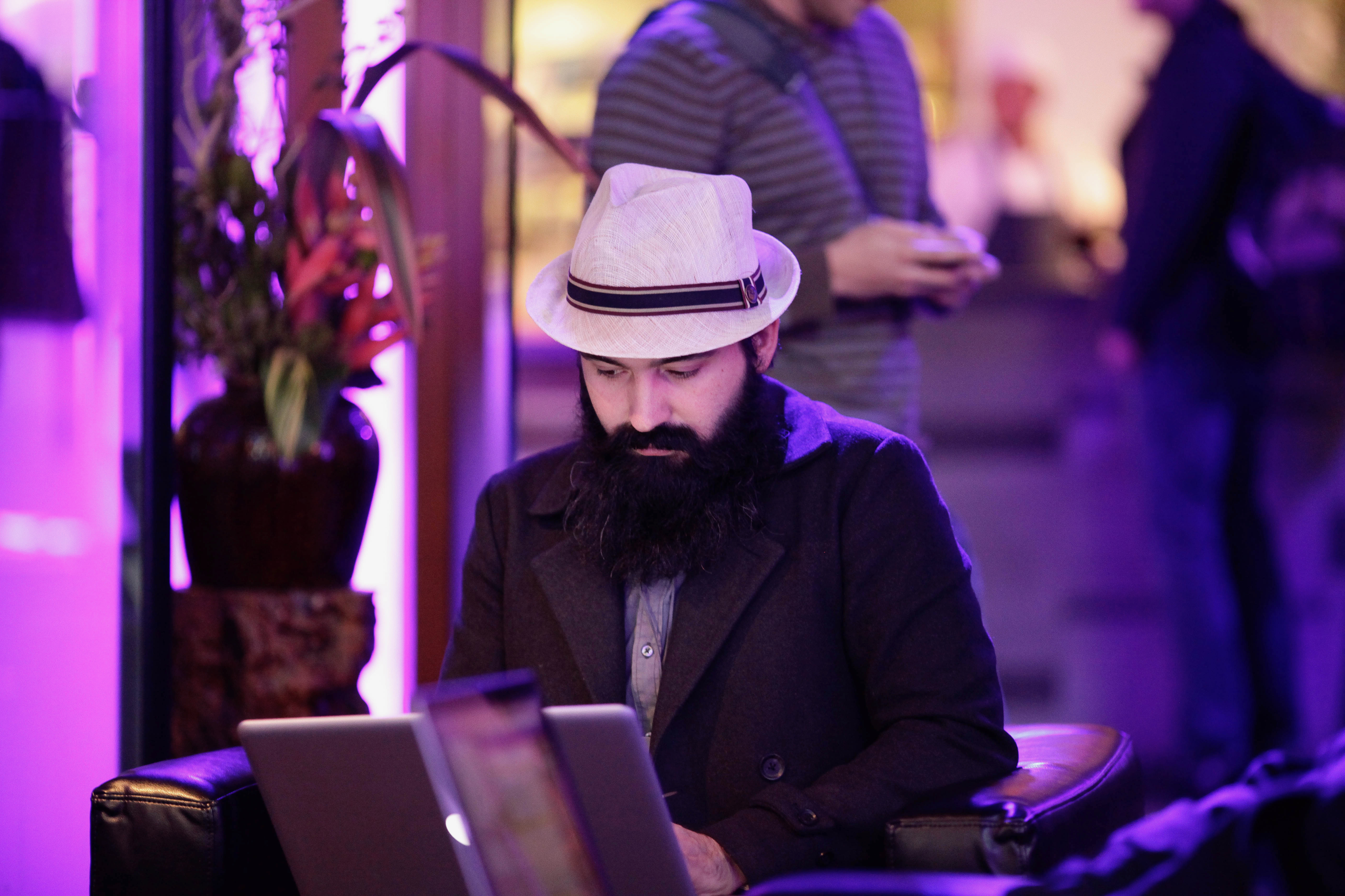 A man with a striking beard and a stylish hat is intently engaged with his laptop, submerged in the warm glow of ambient lighting. The rich purple hues in the background create a relaxed yet dynamic atmosphere, enhancing the contemplative mood. His expression, framed by a dark coat and soft light, draws the viewer into his world of concentration amidst the lively café setting.