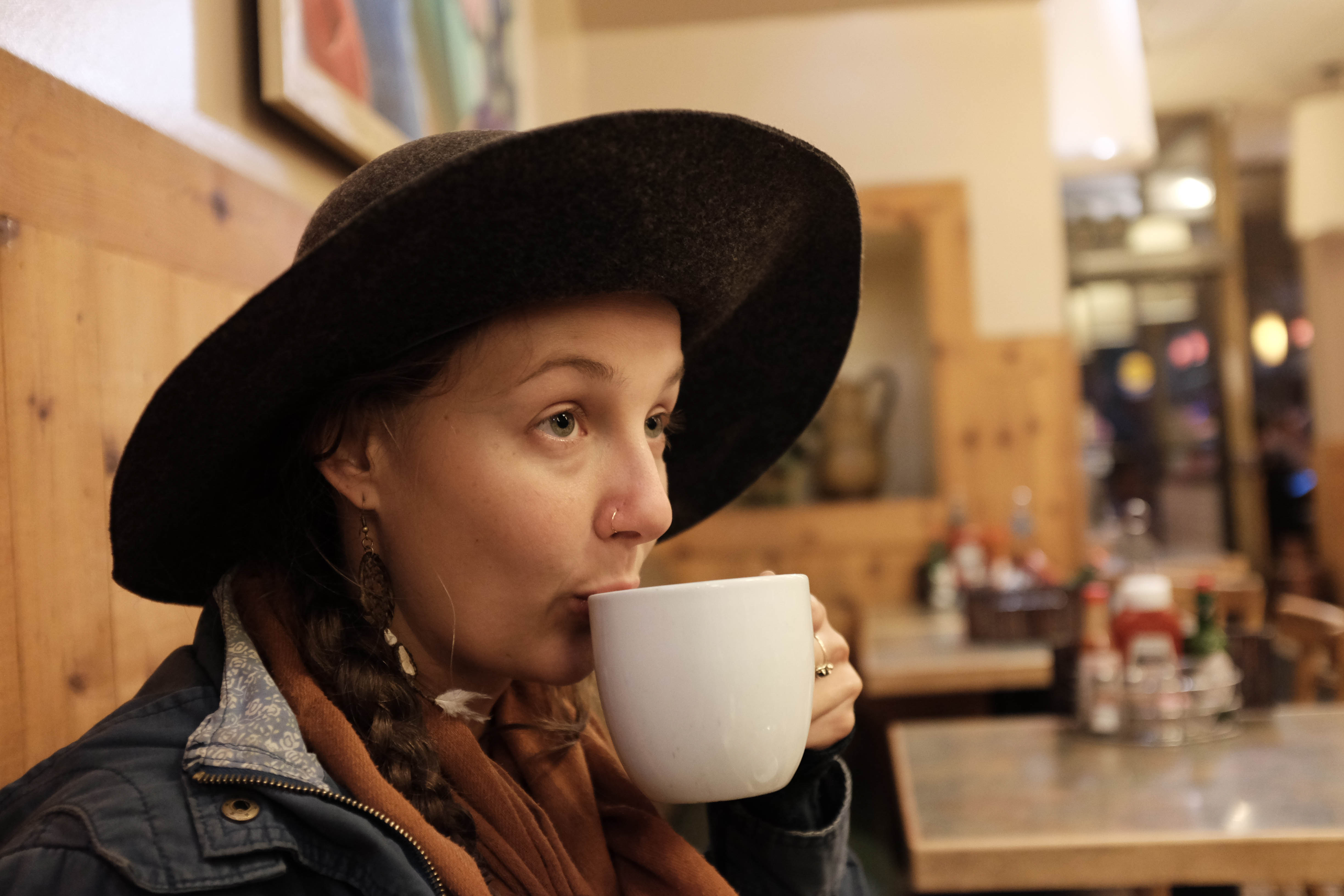 A young woman in a wide-brimmed hat sips from a large white mug, her expression contemplative and serene. The warm interior of the café, accented by wooden textures and soft lighting, adds a cozy ambiance that invites momentary solitude. The soft focus on her face contrasts with the busy background, highlighting her peaceful moment amidst the café's lively atmosphere.