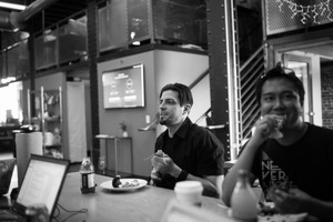 In a modern workspace, two men enjoy a casual lunch at a wooden table, engaged in conversation. The black and white tones enhance the relaxed yet focused atmosphere, with soft lighting emphasizing the simplicity of their moment together amid the industrial setting.