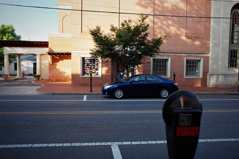 The photograph captures a tranquil moment in an urban setting where a blue car is parked beside a brick wall adorned with windows. Soft morning light casts gentle shadows, providing a warm ambiance that contrasts with the starkness of the meter in the foreground. The composition invites the viewer to explore the quiet charm of city life, highlighted by the hint of greenery and a colorful display in the window.