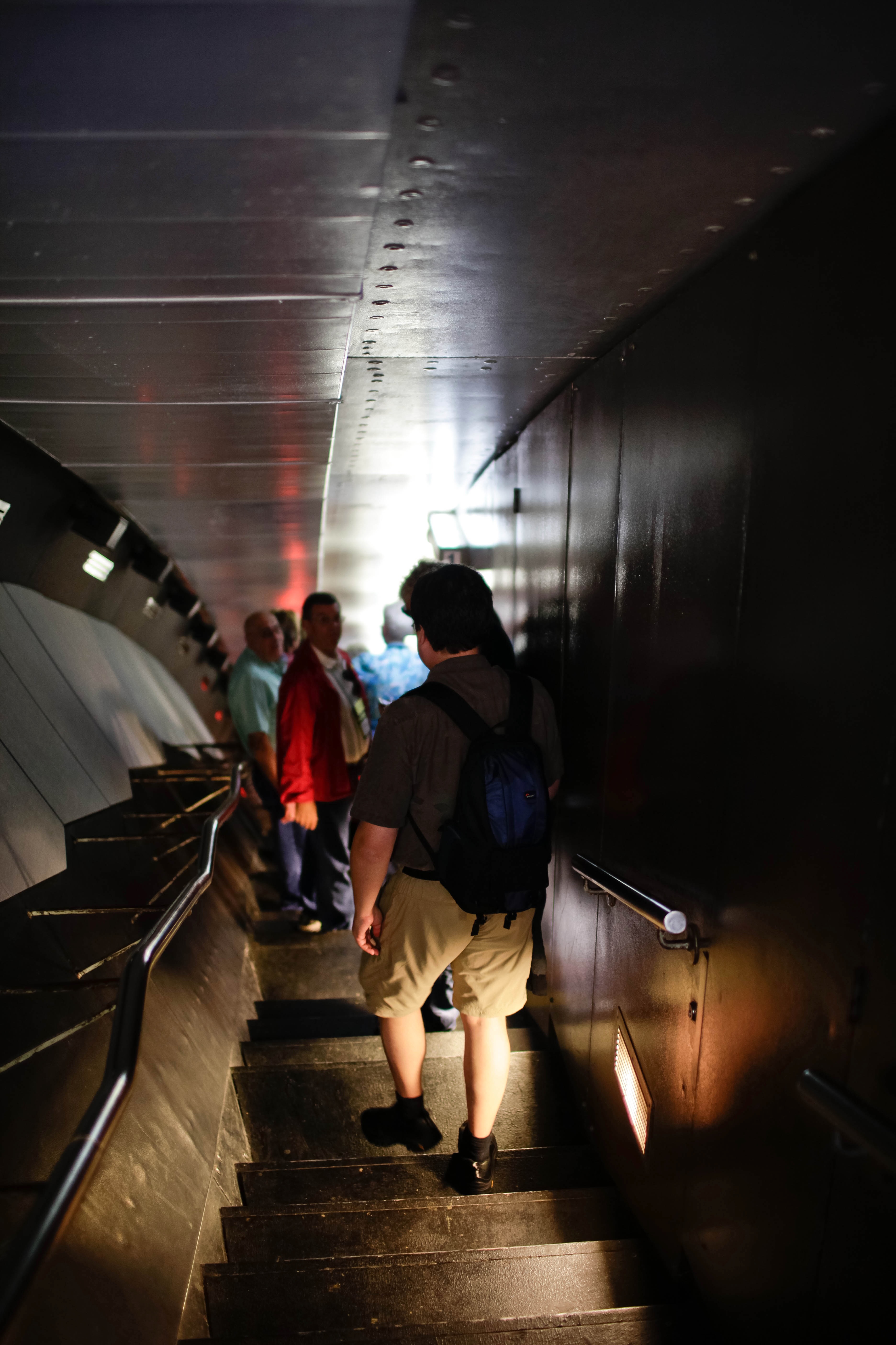 A figure navigates a dimly lit staircase, surrounded by a small group engaged in conversation. The metallic walls reflect soft light, creating an intriguing contrast of shadows and brightness. The atmosphere is a blend of curiosity and anticipation, inviting viewers to wonder about what lies ahead.