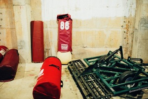 The photograph captures a dimly-lit, abandoned gym environment where the remnants of training equipment linger. An upright padded dummy, marked with the number '88', stands as a solitary figure against a backdrop of worn concrete walls, while scattered red and green equipment scatter the ground, invoking a mood of nostalgia and neglect. The soft lighting accentuates the textures and colors, creating an atmosphere imbued with a sense of lost potential and forgotten dedication.