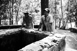 Two men stand at the edge of a weathered stone structure, their expressions reflecting contemplation and curiosity. The black-and-white tones accentuate the surrounding lush greenery, creating a striking contrast that enhances the mood of introspection. Soft, dappled light filters through the trees, adding depth to the scene while evoking a sense of quiet solitude.