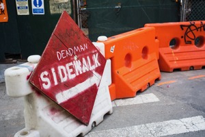 This photograph captures a striking urban scene featuring a vibrant red warning sign, emblazoned with the word 'DEADMAN,' prominently displayed next to orange barricades. The mood is one of caution and unease, enhanced by the gritty surrounding elements and subtle graffiti. The composition effectively draws the eye to the sign while contrasting the stark colors against the muted city backdrop.