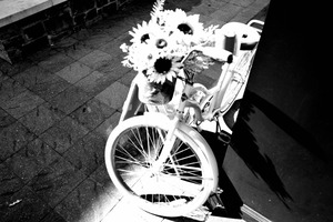 In this monochrome photograph, a white bicycle adorned with sunflowers stands against a dark background, creating a striking contrast that draws the eye. The interplay of light and shadow enhances the texture of the cobblestone pavement, evoking a sense of nostalgia and quiet beauty. The image captures a moment of stillness, inviting the viewer to imagine stories of leisurely rides and sunny days.