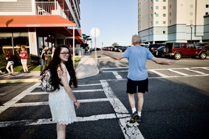 In this lively street scene, a young girl in a white dress shares a joyful moment with an older man, who theatrically gestures as he walks ahead. The warm afternoon light beautifully captures their expressions, creating a playful atmosphere against the backdrop of modern architecture and candid onlookers. The composition invites the viewer to reflect on the connection between youth and age, filled with spontaneity and shared laughter.