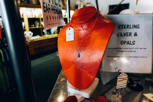 A vibrant red jewelry display bust showcases a delicate necklace featuring a small pendant, casting an inviting allure. The warm lighting enhances the rich hues of the bust while softening the surrounding atmosphere, creating a cozy, boutique-like mood. Background details hint at an eclectic assortment of accessories, drawing the viewer's eye toward the featured piece.
