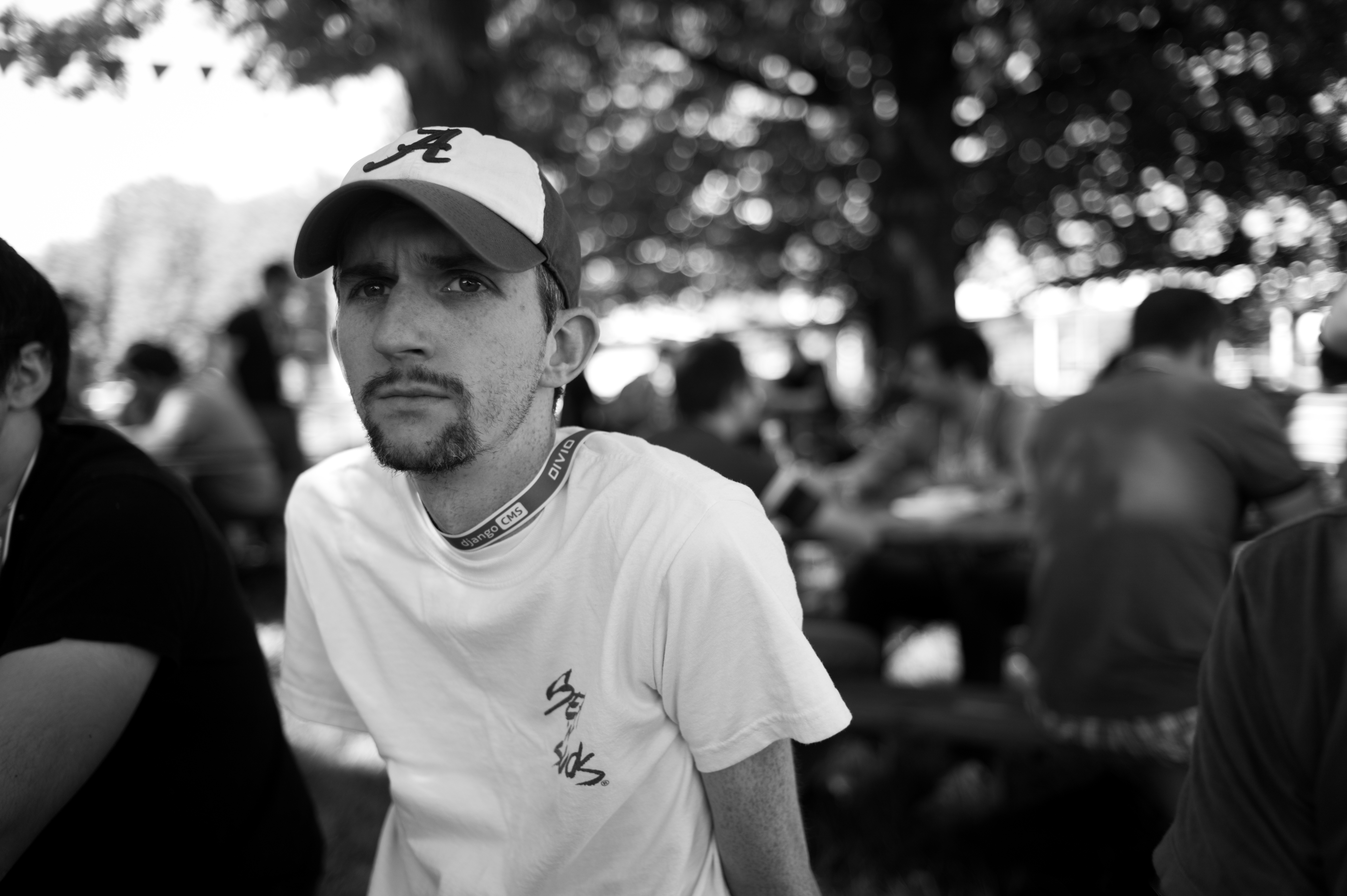 A young man sits in a bustling outdoor setting, his expression a blend of contemplation and curiosity. Soft, diffused light filters through the leaves above, creating a gentle, serene mood amidst the lively background of blurred figures and distant conversations. The black-and-white composition emphasizes the subject's intensity and the communal atmosphere, drawing the viewer's focus to his thoughtful demeanor.