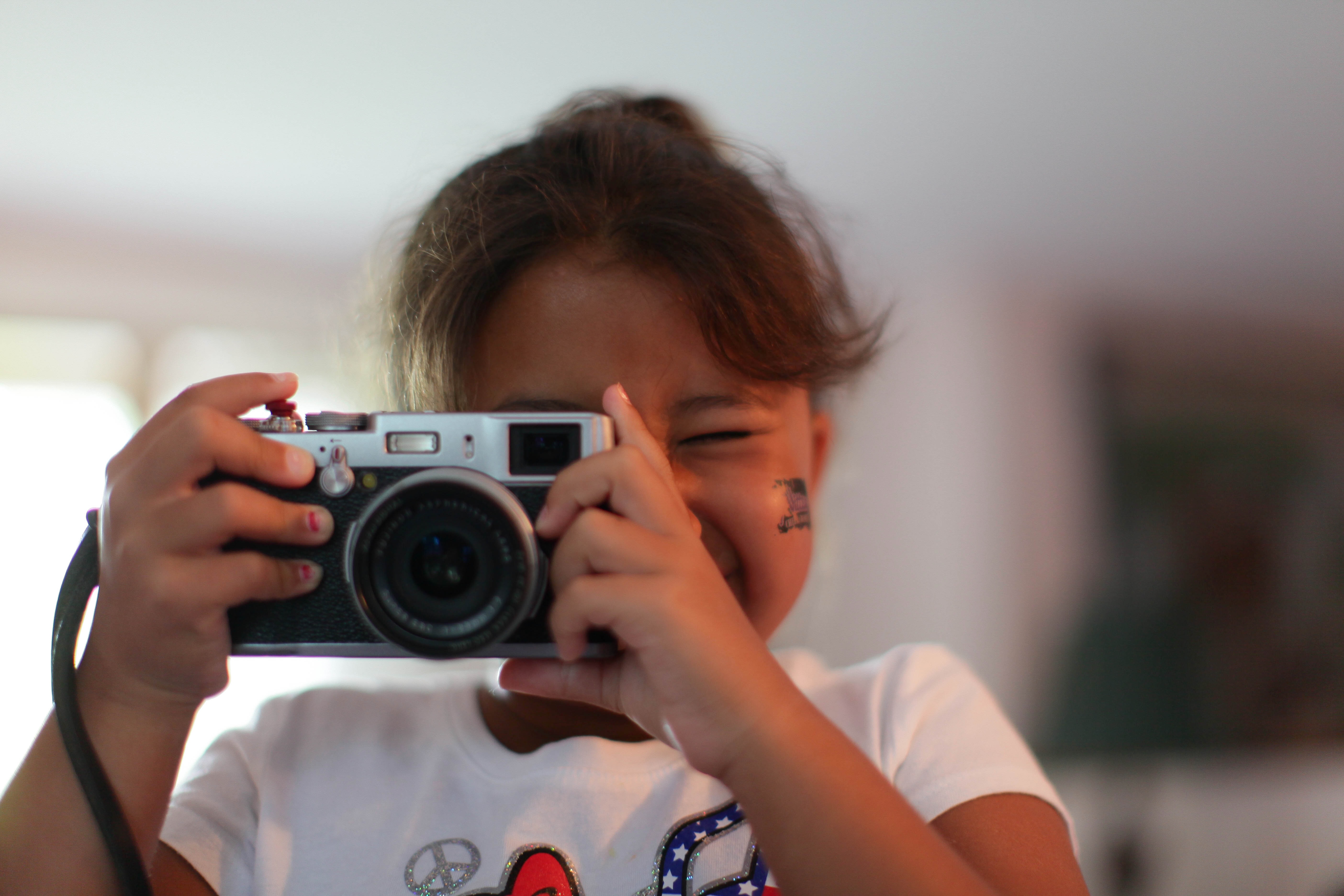 A young girl joyfully holds a vintage camera, playfully aiming it towards the viewer. The soft lighting highlights her smiling expression, conveying a sense of innocence and excitement. The blurred background creates a warm and intimate atmosphere, focusing attention on her vibrant energy.