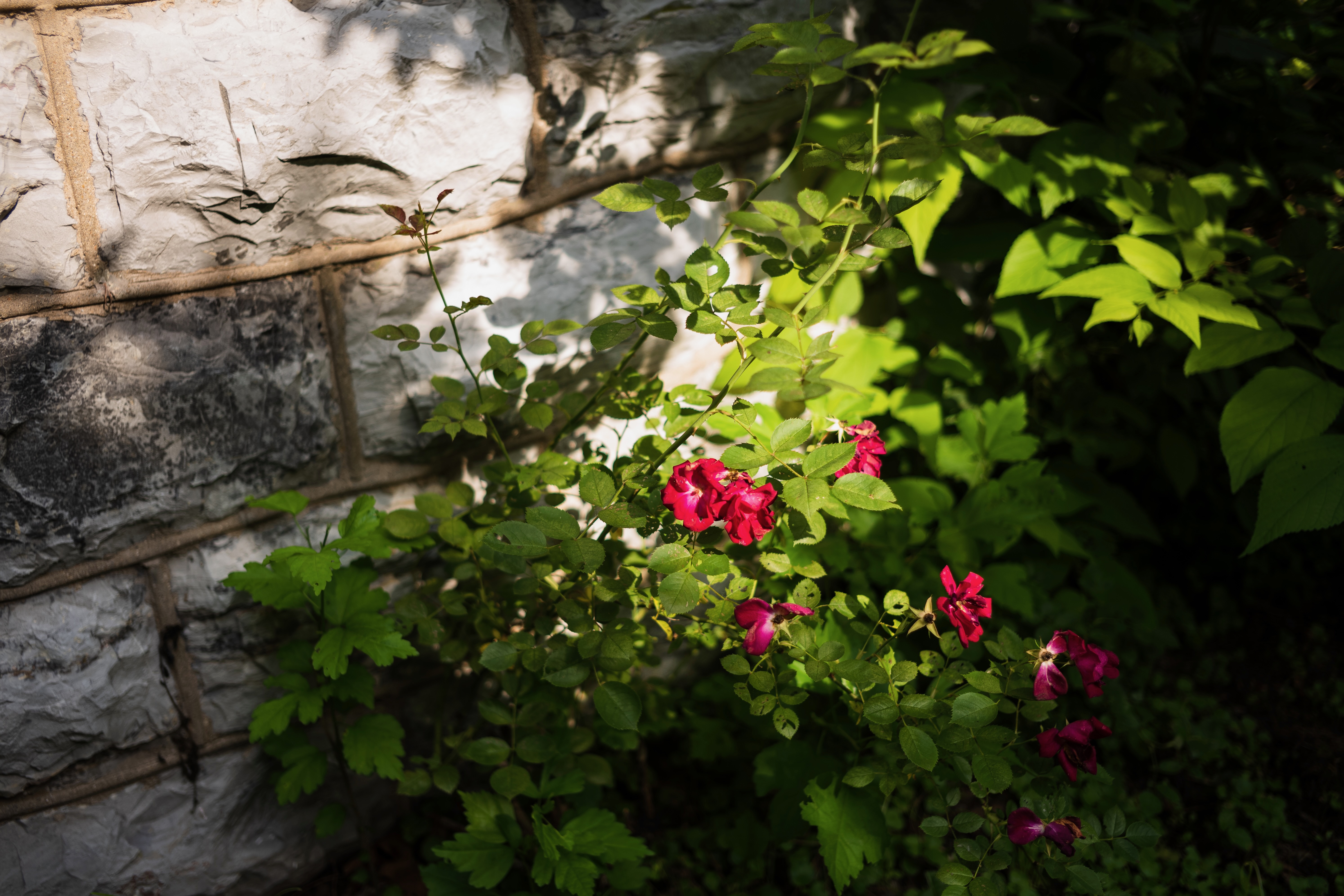 A vibrant cluster of pink flowers emerges against the rough, textured backdrop of a stone wall. Sunlight dances through the foliage, casting soft shadows that enhance the serene, contemplative mood of the scene. The composition invites the viewer to appreciate the delicate beauty thriving amidst the starkness of the surroundings.