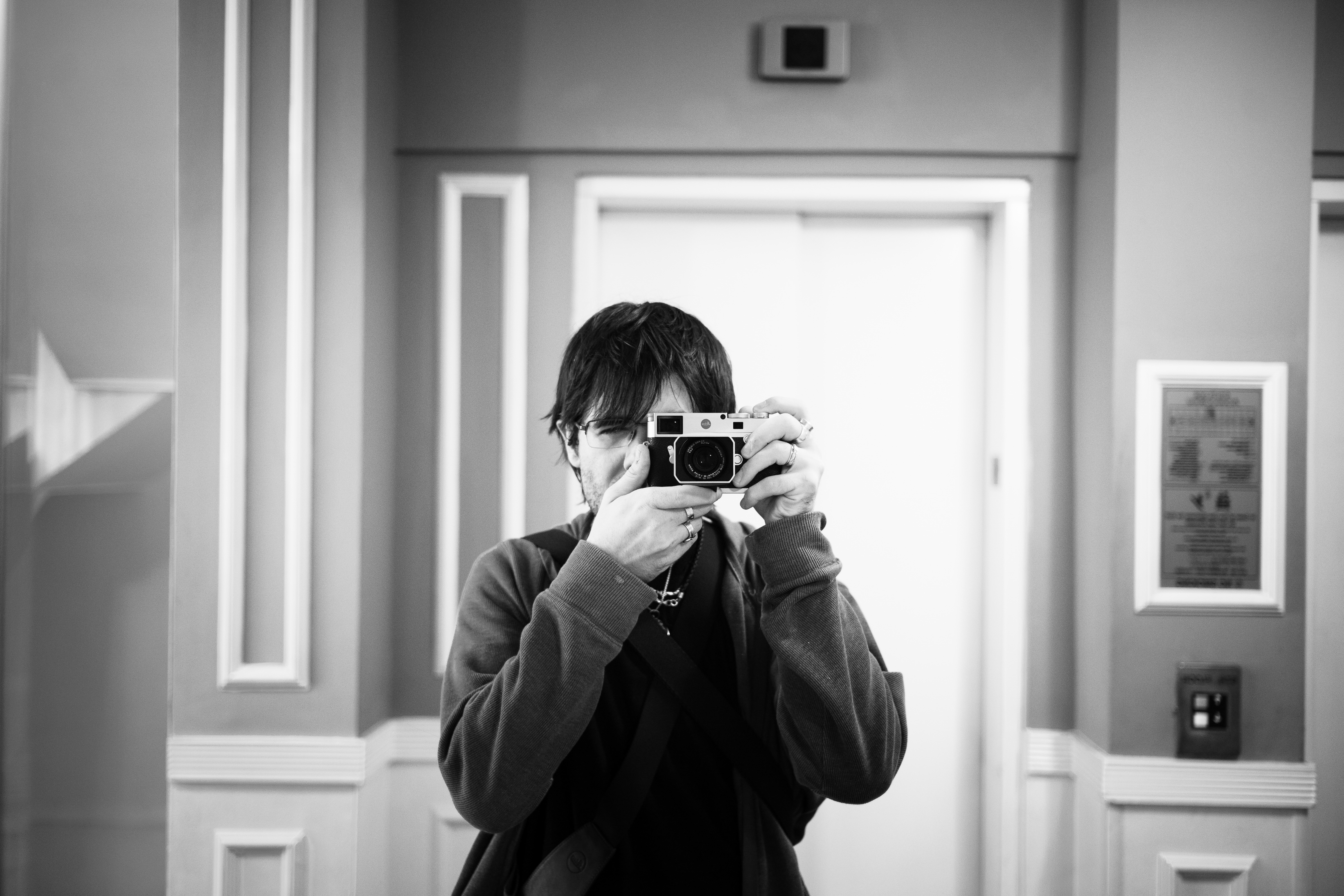 In this monochromatic photograph, a person stands before a mirror, capturing themselves with a vintage camera, exuding a sense of introspection and creativity. The subdued lighting and minimalist composition emphasize the subject's focused gaze and the nostalgia of photography itself. The crisp lines of the elevator backdrop juxtapose with the soft shadows, enhancing the intimate, contemplative mood of the scene.