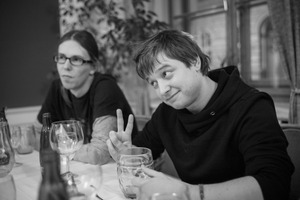 The photograph captures a candid moment at a dining table, where a young man playfully poses with a peace sign, contrasting the serious demeanor of his companion. Soft, muted lighting highlights their expressions, creating an intimate atmosphere that suggests a relaxed social gathering. The black-and-white treatment adds a timeless quality, focusing attention on their interactions amidst a backdrop of empty glasses and foliage.