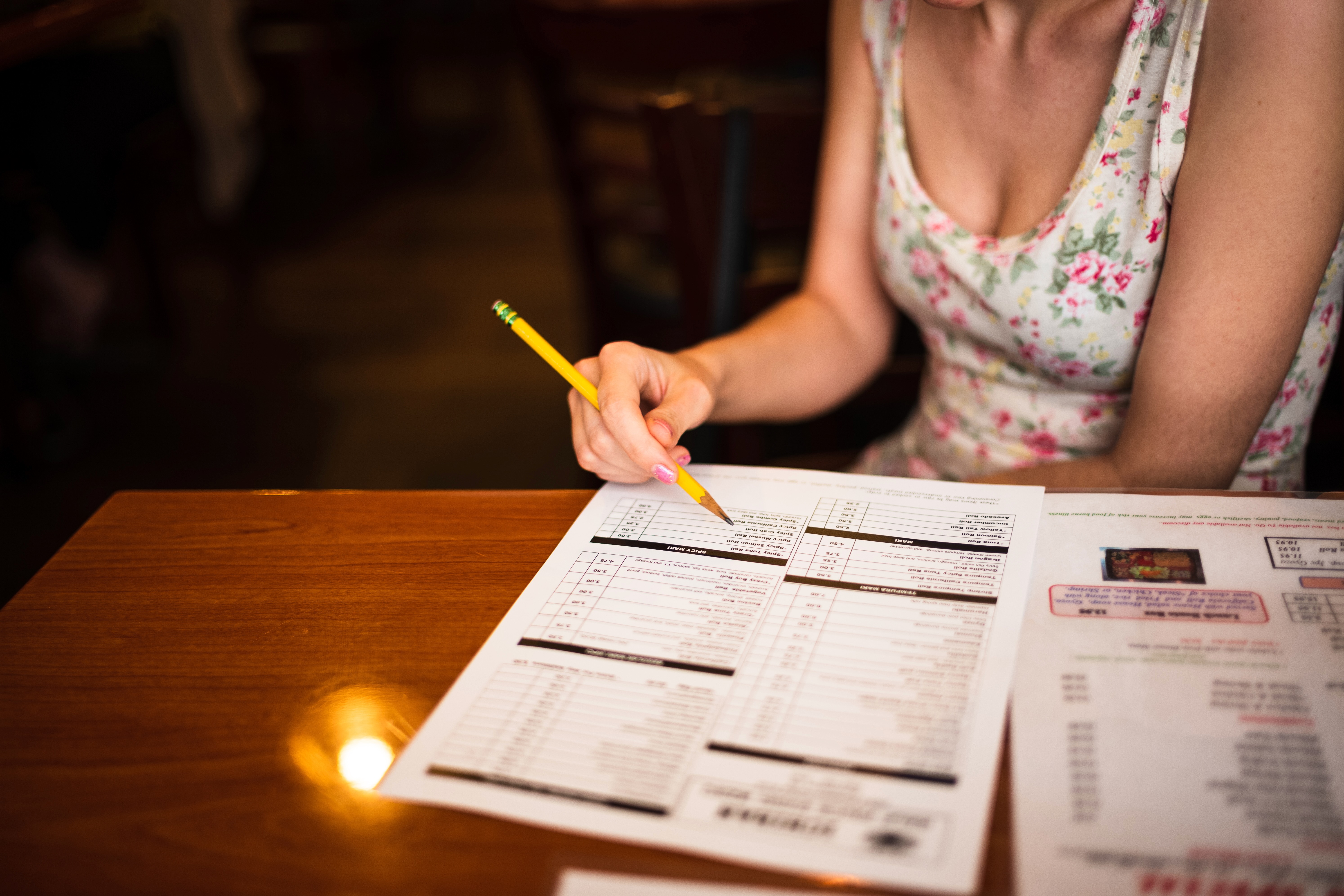 In a cozy restaurant setting, a woman in a floral top attentively studies a menu while poised to mark her selections with a bright yellow pencil. The warm, inviting lighting accentuates the wooden table and creates a relaxed, contemplative atmosphere, inviting viewers to share in the moment of decision-making over a meal.