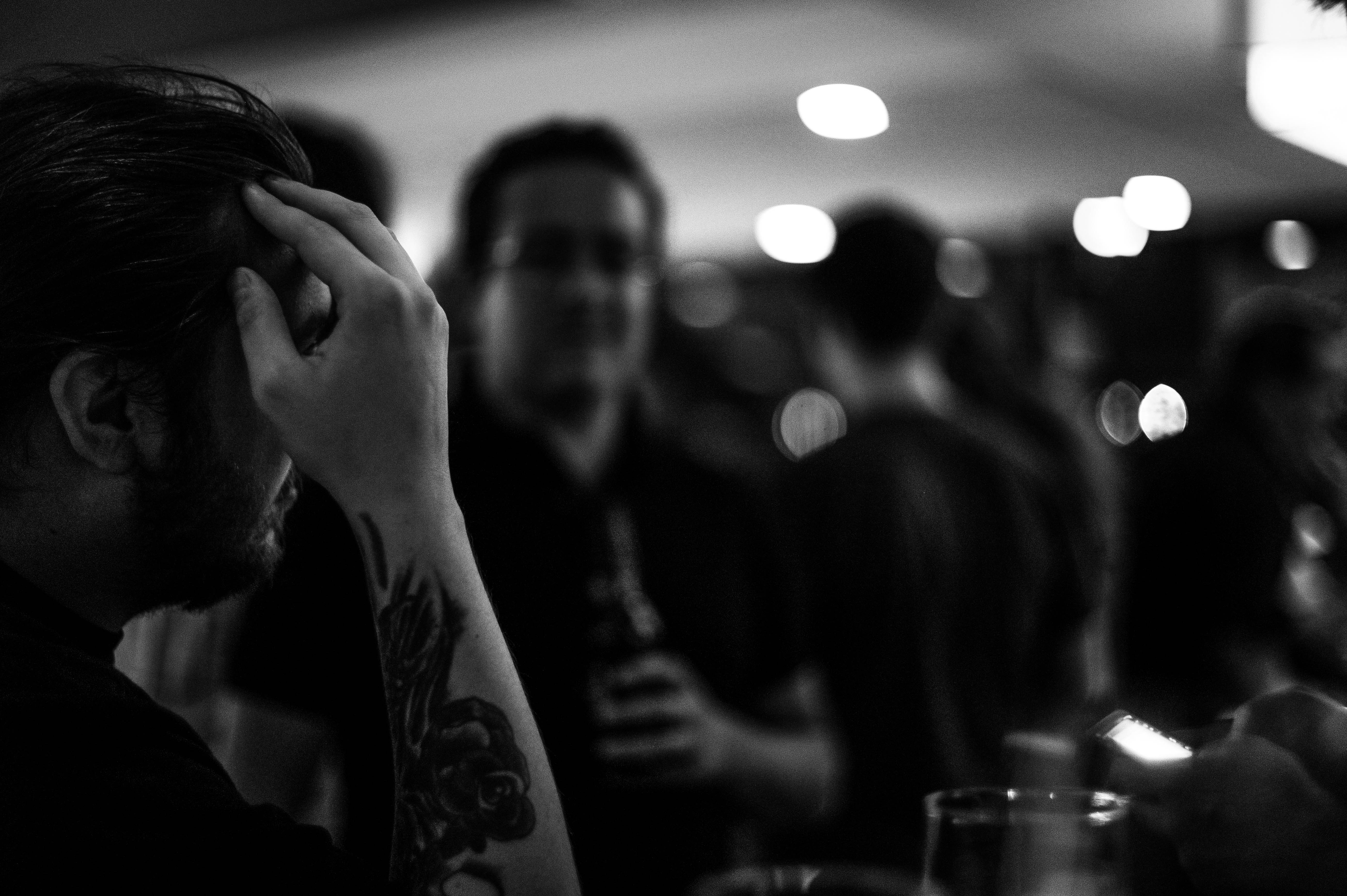 In a dimly lit space, a man with a tattooed arm rests his forehead against his hand, embodying a mood of introspection or fatigue. The blurred figures behind him suggest a bustling social environment, contrasting with his contemplative demeanor. Soft, diffused lighting punctuates the scene, enhancing the atmosphere of quiet chaos and emotional weight.