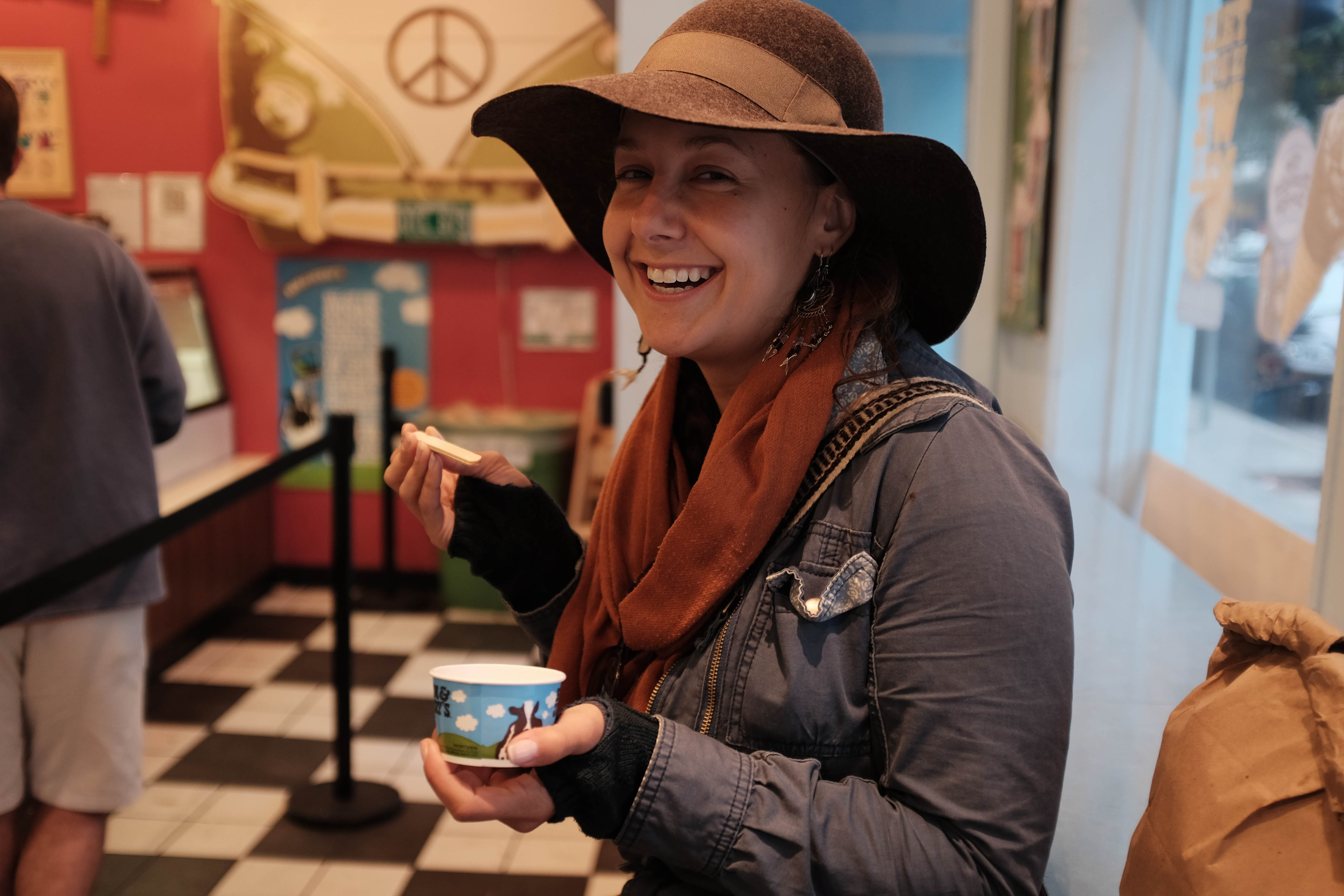 A woman beams as she holds a cup of ice cream, her playful spirit radiating against a colorful backdrop. The warm tones of her hat and scarf contrast beautifully with the cool hues of her treat, evoking a sense of comfort and delight in this inviting setting. Soft, natural lighting accentuates her smile, making the moment feel spontaneous and joyful.
