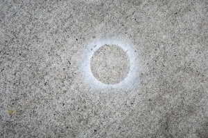 This photograph captures a stark, white circle against a textured gray concrete backdrop. The simplicity of the circular form contrasts with the rough, speckled surface, creating an intriguing focal point that draws the eye. The muted lighting enhances the minimalist vibe, evoking a sense of calm and contemplation.