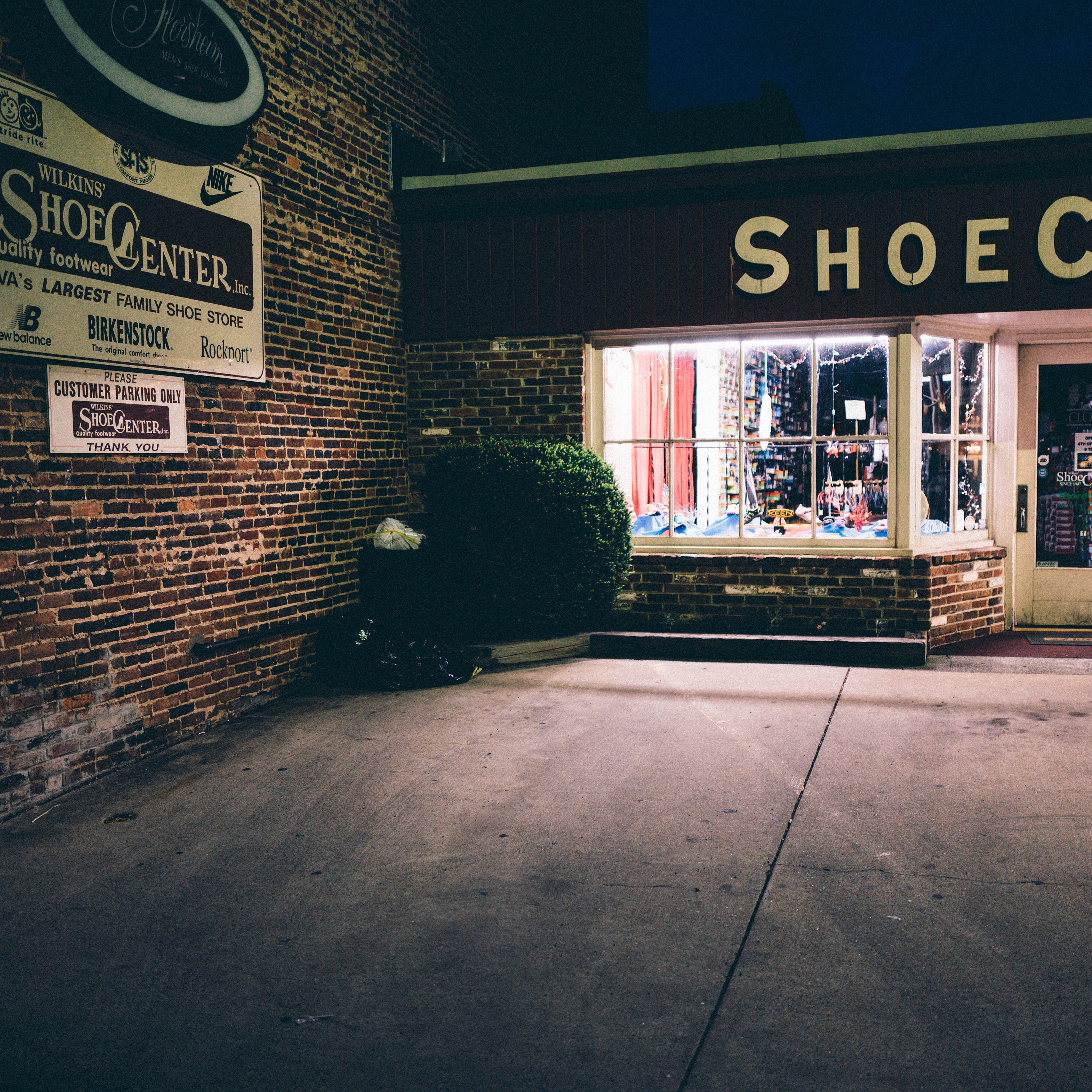The photograph captures a quiet moment outside Wilkins' Shoe Center at night, with warm light spilling from the shop window, inviting yet solitary. The brick wall and surrounding darkness create a contrast that emphasizes the store's rustic charm, while the neatly trimmed bush adds a touch of greenery. Hints of urban life are ghostly present, suggesting a sense of nostalgia and the comforts of local commerce.