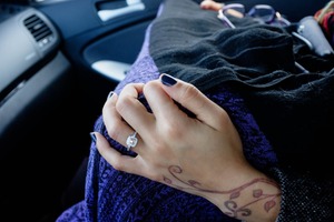 The photograph captures a close-up of a hand adorned with a delicate ring and intricate henna designs, resting gently on a black garment. The soft, natural lighting filters through the car, creating a serene atmosphere that highlights the textures and colors of the fabrics. The composition draws the viewer's attention to the personal connection between the hand and the clothing, evoking a sense of warmth and intimacy.