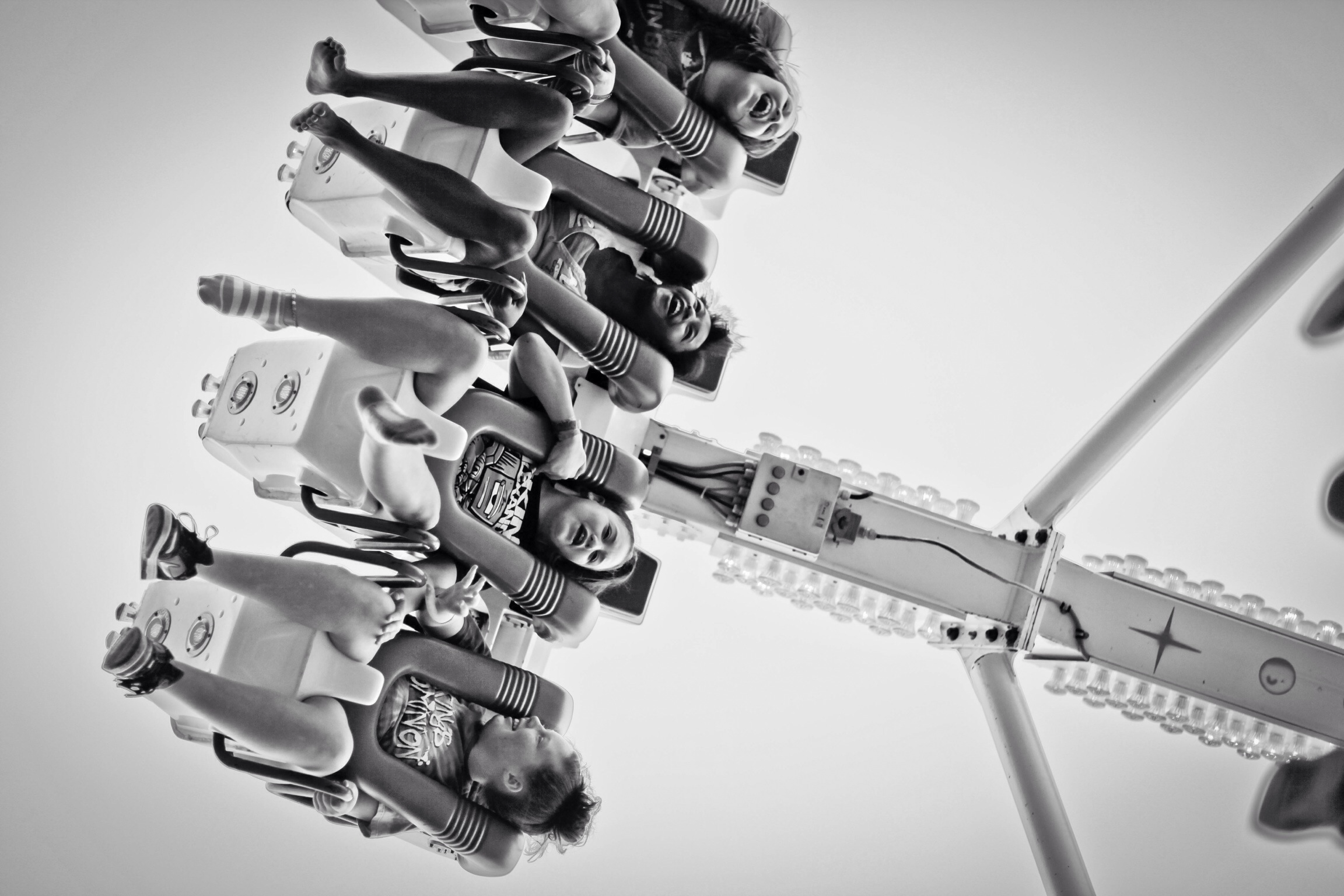 In a dynamic black-and-white capture, a group of exhilarated riders dangles upside down on a thrilling amusement park attraction. Their expressions reflect a mix of joy and fear, emphasizing the sheer thrill of the experience. The upward angle enhances the sense of danger and excitement, framed by the stark contrast of the sky and the ride's structure, creating an electrifying atmosphere.