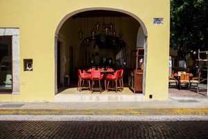 This photograph captures a warm and inviting restaurant entrance framed by a bright yellow wall and an archway. The rich red chairs contrast beautifully with the sunlit interior, creating a cheerful atmosphere that beckons passersby to step inside. Soft shadows play across the cobblestone street, enhancing the serene yet lively mood of the scene.