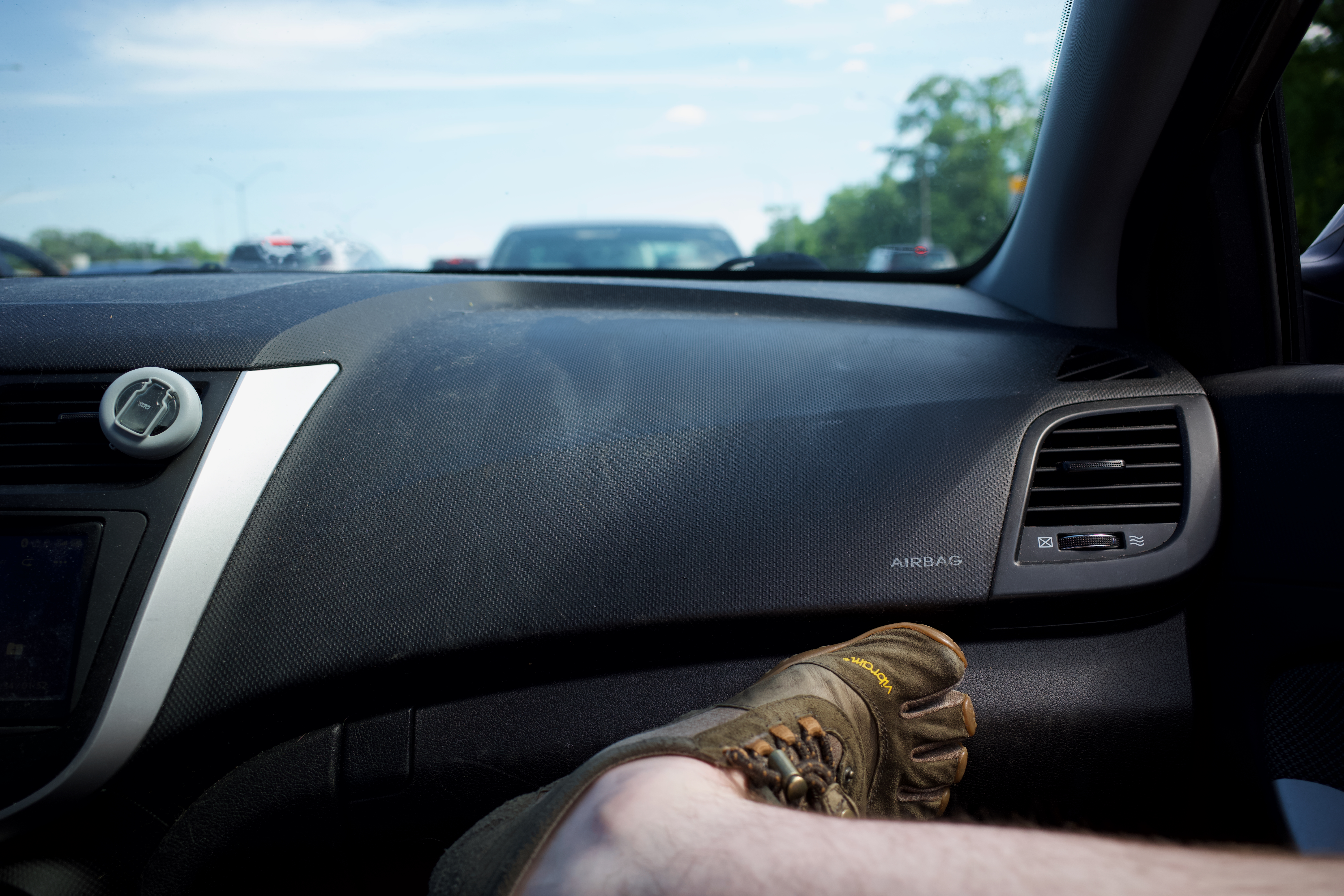 This photograph captures a relaxed yet tense moment inside a car, with a foot casually resting on the dashboard. The bright daylight filters in, illuminating the interior and creating a contrast with the blurred traffic outside, evoking a sense of stillness amid the movement. The angle and composition invite the viewer to ponder the journey ahead, balancing comfort and restlessness.