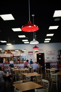 The photograph captures a lively fast-food restaurant with bright red pendant lights hanging from a black ceiling, creating a dynamic contrast. The warm ambiance invites diners to enjoy their meals at simple wooden tables, while soft lighting and a bustling kitchen in the background enhance the casual, welcoming atmosphere. The blend of shadows and lights reflects a modern, approachable eatery where conversations and shared moments unfold.