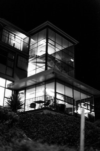 Bathed in a haunting glow, the glass structure rises against the night sky, exuding a sense of modern elegance. The interplay of shadow and light highlights the sleek lines and contours of the design, inviting intrigue amidst the darkness. A lush greenery backdrop adds depth, contrasting with the bright interior that reveals glimpses of life within.