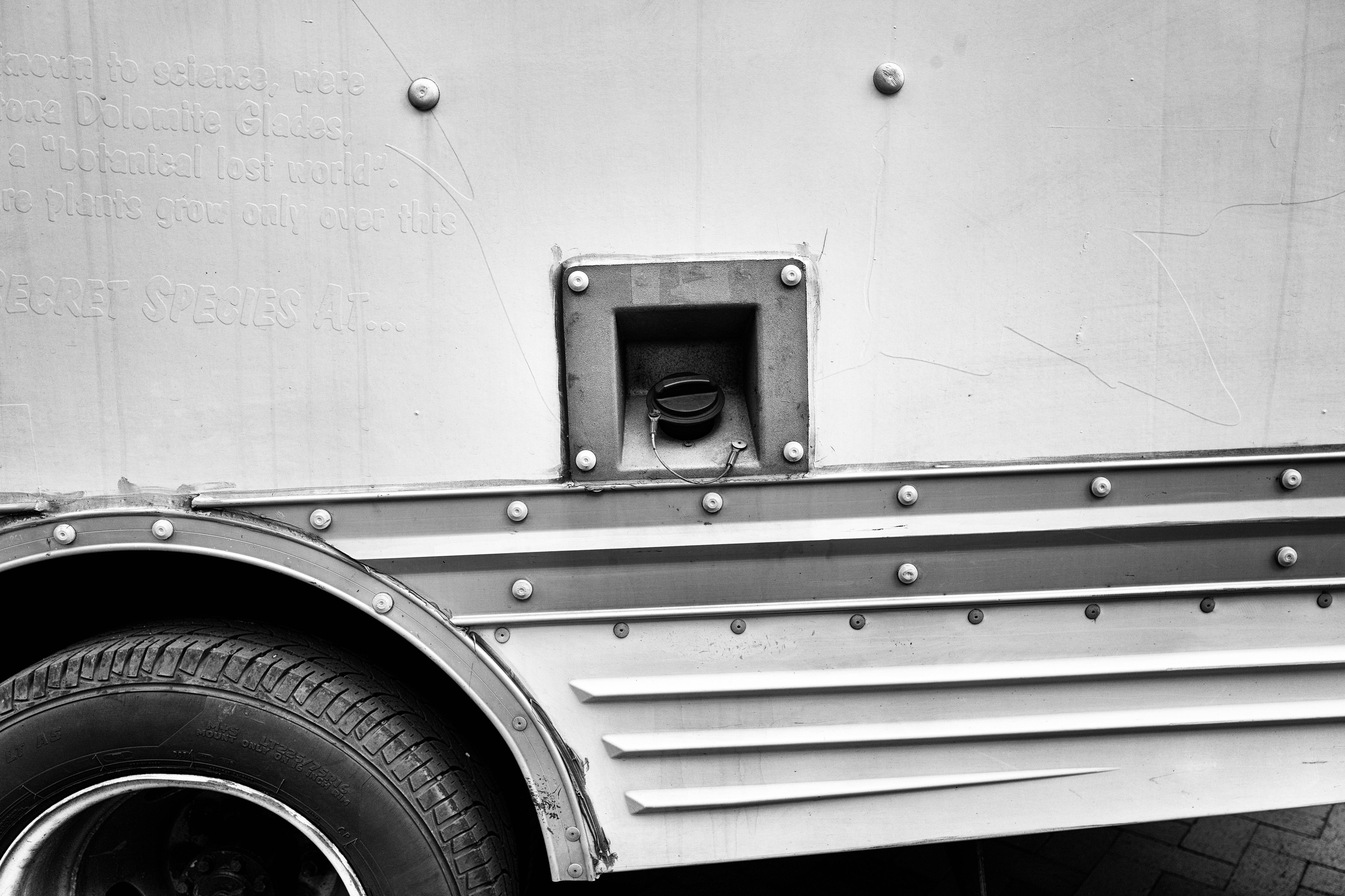 The photograph captures the textured side of a weathered vehicle, blending industrial elements with a hint of mystery. The stark black-and-white contrast emphasizes the rugged details, enhancing the mood of neglect and secrecy. A small window reveals an enigmatic void, inviting curiosity about the journey this forgotten object has seen.