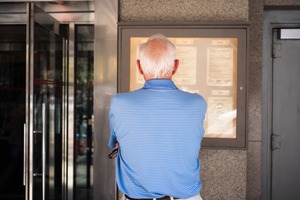 An elderly man stands thoughtfully with his arms crossed, focused on a notice board that hints at stories untold. Soft lighting accentuates the contours of his white hair and the calmness of the moment, creating a serene atmosphere. The composition captures a mix of nostalgia and curiosity, inviting viewers to ponder the man's reflections and associations with the past.