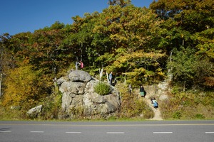 This photograph captures a vibrant autumn scene where individuals traverse a rocky outcrop amidst a backdrop of colorful fall foliage. Bright sunlight bathes the landscape, enhancing the golden hues of the leaves and casting soft shadows on the rocky surface. The composition invites a sense of adventure and exploration, perfectly reflecting the joyful spirit of nature enthusiasts venturing into the great outdoors.