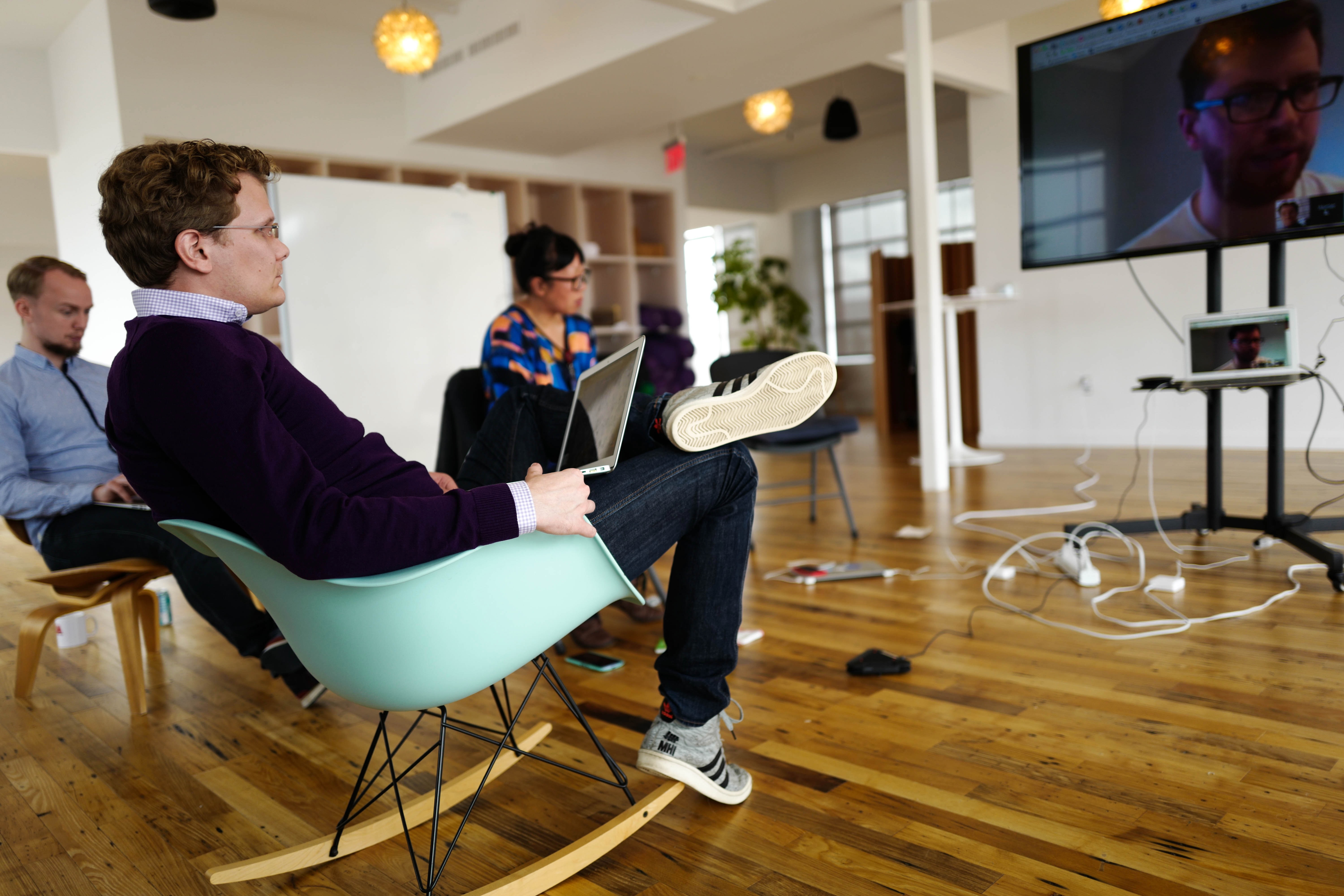 In a spacious, modern workspace, a group of people engages in remote collaboration. Soft natural light floods the room, highlighting comfortable seating and the fusion of technology and creativity, while the relaxed postures convey a blend of focus and ease in this dynamic environment.