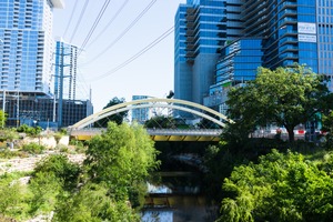This photograph captures the graceful arc of a yellow bridge arching over a tranquil waterway, framed by sleek, modern skyscrapers. Lush greenery juxtaposes the urban backdrop, creating a refreshing contrast against the clear blue sky. The bright lighting enhances the vibrant colors, lending a lively yet serene mood to the scene.