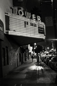 This photograph captures a lonely street scene under the soft glow of streetlights, with an old theater marquee displaying 'FOR SALE'. The black-and-white composition enhances the nostalgic mood, evoking a sense of loss and forgotten memories as shadows stretch across the pavement, punctuated by a solitary figure walking in the distance.